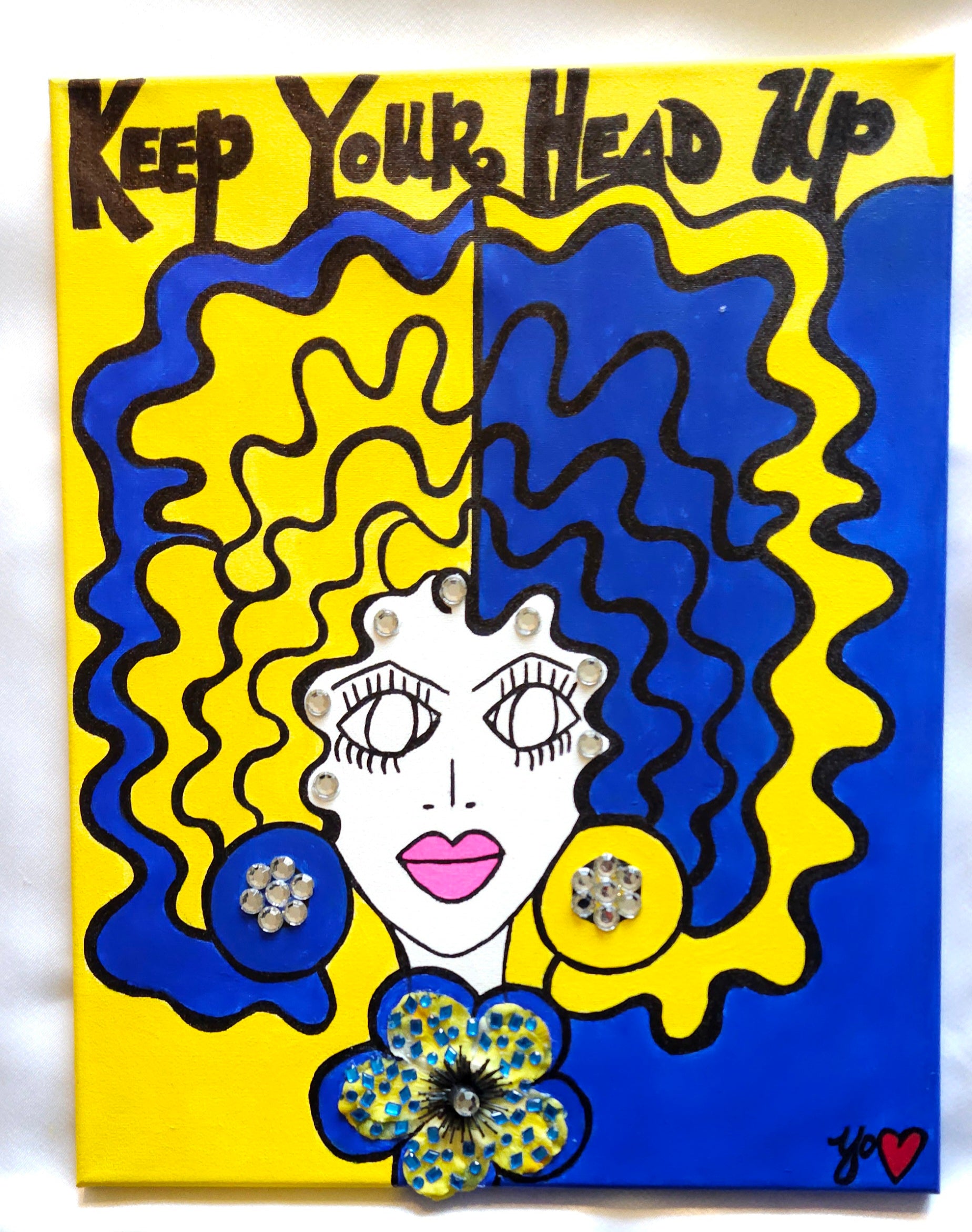 Bold Maize and Blue painting from the "Keep Your Head UP" Collection with embellishments